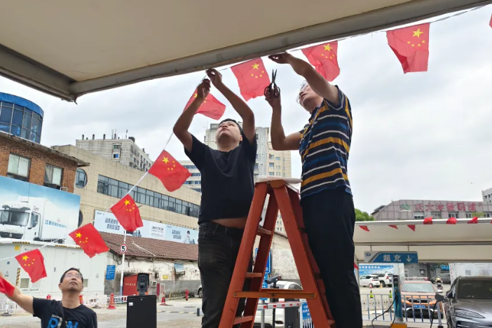 9月25日,在物業經營分公司停車場內,一面面嶄新的五星紅旗被整齊懸掛充電站及停車場出入口顯眼位置,鮮紅的旗